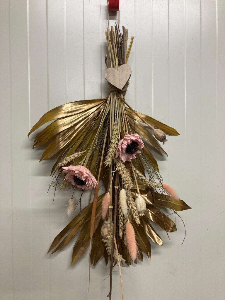 Deze stijlvolle droogbloemenhanger is een echte blikvanger voor aan de muur of deur. Met gouden palmbladeren, zachte pluimpjes, roze gerbera’s en een houten hartje straalt dit stuk warmte en liefde uit. Het natuurlijke jute touw maakt het makkelijk op te hangen. Perfect als wanddecoratie of als origineel cadeau met een persoonlijke touch. Met de hand gemaakt door Creaby Gerda – elk exemplaar is uniek!