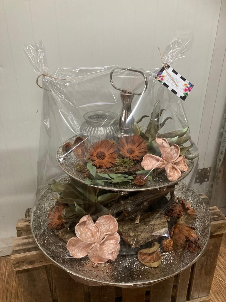 Een echte eyecatcher! Deze tweelaagse metalen schaal is met zorg gevuld met warme natuurelementen zoals hout, dennenappels, kunstbloemen en groene accenten. De glanzende bloemdecoraties geven een zachte, vrouwelijke touch. Mooi verpakt in folie en afgewerkt met een luxe kaartje – klaar om cadeau te geven of je eigen interieur extra sfeer te geven. Handgemaakt en uniek, zoals je van Creaby Gerda gewend bent.