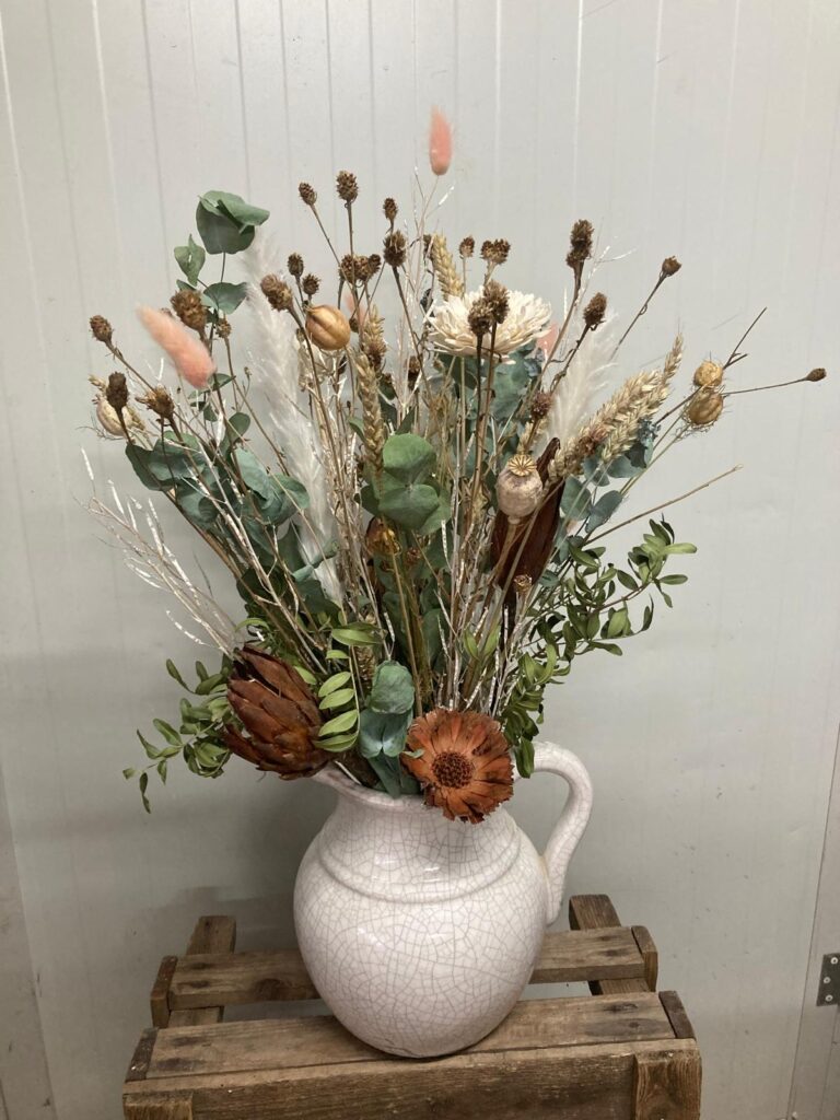 Puur natuur in een landelijke stijl! Dit royaal gevulde boeket van droogbloemen zit stevig in een karakteristieke witte sierkan met craquelé-effect. De combinatie van tarwe, eucalyptus, zaaddozen, takjes en zachte pastelaccenten zorgt voor een rustieke en warme uitstraling. Blijvend mooi, ideaal voor op de eettafel, vensterbank of als origineel cadeau. Elk stuk is met liefde en oog voor detail samengesteld door Creaby Gerda.